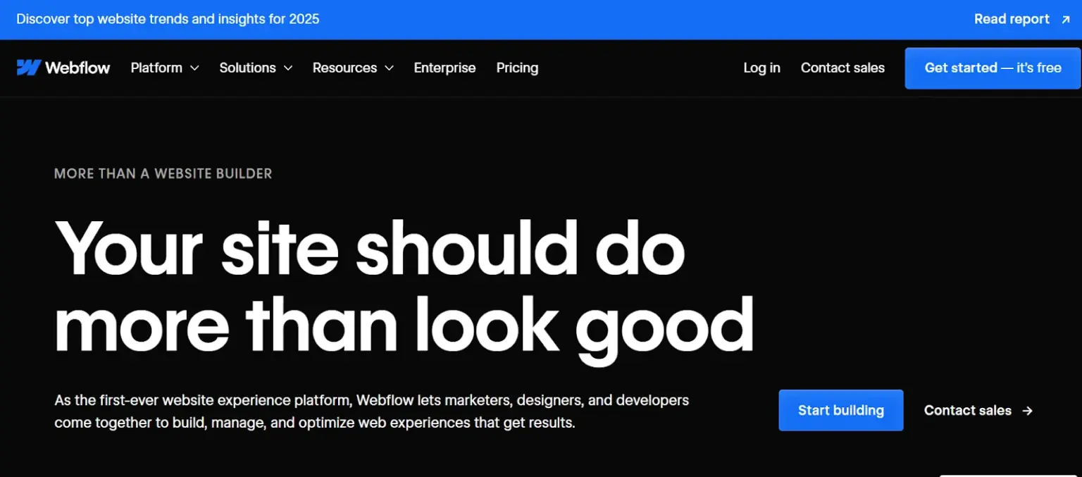 Webflow combines design and development, offering visual layout control and a robust CMS.
